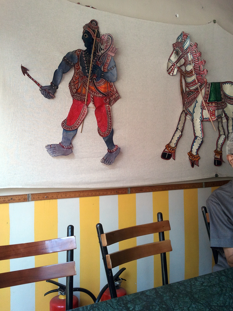 Carnatic Café is a small, unpretentious restaurant on the ground floor of the tiny shopping centre which also houses The Rampur Kitchen. A bright mustard yellow sign with quirky black lettering adorns the outside of the Café (the other side, closed off by plate glass, looks out onto a bank of potted plants). Inside, the decor consists of odds and ends: a little forest of fluttering paper cut outs hanging from the ceiling near the entrance (which, by the way abuts the kitchen, so you can actually have the chance to see some cookery in progress, as we did); three large and attractive leather puppets pinned to a sheet draped on a wall; and bunches of dried (fake?) maize hanging from the ceiling. A glimpse of Karnataka, but not overdone. There are some eight or ten tables in here, seating two to four people each.