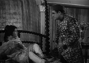 All of the efforts of Naaz, Ejaz, Quasar and Mehmood finally pay off, and the two lovebirds (Ejaz and Naaz) are able to spend enough time together singing a love song and looking soulfully into each other’s eyes. Sadly, they pick the wrong time, the wrong place: Naaz’s father, Nawab Bakar Ali Khan, happens to come by just then (what rotten luck!) and sees the duo and hears their duet. He is furious, and drags Naaz home, berating her for having blackened the family’s honour.