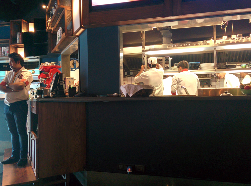While we waited for our food to arrive, we looked around a bit. Directly in front of us was the open kitchen, with—above the large glass window—three flat screen TVs. On one screen a football match (yes, well; the World Cup is on, after all!) was being shown. On another, a TV food show was playing. On the central one—for some reason neither of us could fathom—a camera trained on part of Terminus 1’s kitchen was giving a live feed. A chopping board, a knife, a chef standing and lounging about with his hands behind his back. Nothing even vaguely interesting, so the whole point of it escaped me. (Unless, of course, this is a means of making sure that the kitchen staff follow hygienic practices, since they’ll be in public view all the time).