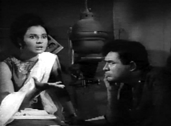 Jai is firmly convinced that Seema-turned-Asha, his bhabhi to be, is utterly nuts. Look at the way she behaves, he tells Shankar. A candidate for the nuthouse. Shankar should take her to their old friend Dr Pal, who’s a psychiatrist [and, as we later discover, not much further on the road to sanity than several of the inmates of his mental hospital]. Shankar is, after much dithering, finally convinced. He agrees that he’ll go the next day to his beloved’s house and wheedle her into coming to Dr Pal’s.