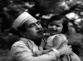 …but the swirling waters wreak havoc on the family. While Mr Gupta and Asha wash up safe and sound on the riverbank, Mrs Gupta is swept away downriver. When she comes to, she has lost her memory [along with her daughter, though she doesn’t know that yet, since she doesn’t even know now that she has daughters or a husband]. She goes off by herself, while little Seema, coming ashore further away, is found by a wealthy but eccentric Seth (Ulhas).