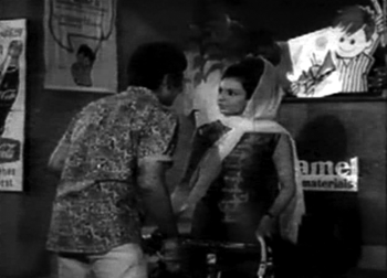 Meanwhile, Shankar has been busy hoisting up, outside his shop and with Jai’s help, a rather risqué painting he’s made of Seema-turned-Asha [the pose she’s striking, and the extent of her clothing, seem to have been what inspired RK re Mandakini in Ram Teri Ganga Maili]. Shankar is very proud of his handiwork on this painting, and is certain his sweetheart is going to approve of it too.