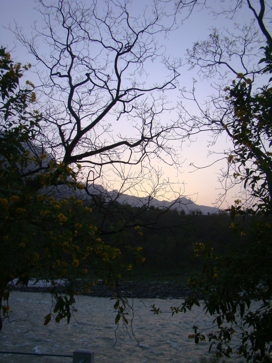 Although one could drive down to Rishikesh and visit the temples there, or go white water rafting, rappelling, trekking, rock climbing, and so so, all we were interested in was unwinding. Our two days at The Glasshouse on the Ganges, therefore, consisted of doing nothing terribly productive. Between meals, we’d either sit out in the little verandah (shaded by litchi trees, a pear tree, and a chilbhil tree, the latter bearing papery-winged seeds that are great fun to peel and nibble on) having tea, reading, and watching bulbuls, tree pies, and little songbirds on the trees, or we’d go down to the silvery-grey beach and sit on one of the rocks, trailing our feet in the cool water. Bliss.