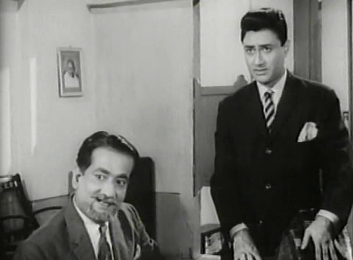 … introducing us to Dev Anand’s character. This is a lawyer named Rajesh, whose munshi (Johnny Walker) comes with the rather unwieldy name of Chunnilal Ishwarlal Dholakia, which he has sensibly shortened to CID. CID rues the fact that Rajesh doesn’t take on any cases and is happier spending his time cycling about the countryside, singing songs.
