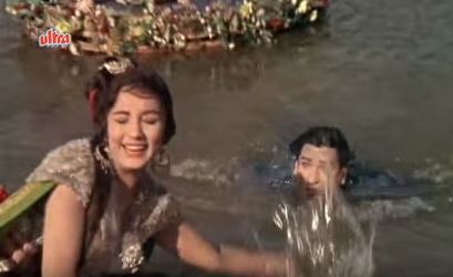 2. Aaja aayi bahaar (Rajkumar, 1964): While on the topic of Shammi Kapoor, another song which features him, and begins with Aaja. This one couldn’t be more different from Aaja aaja main hoon pyaar tera, despite the presence of Shammi Kapoor, some very hectic dancing, and a lovely leading lady. Sadhana’s Princess Sangeeta hasn’t the slightest idea that the love of her life is waiting around the corner (or, rather, deep in the water, with a reed sticking up as a makeshift snorkel): all she’s doing is having a swimming picnic with a bunch of friends. And spending her time calling to the man whom she’s certain awaits her. Sadhana is lovely, Shammi Kapoor is fun and the landscape (especially the cascades) is impressive but I personally don’t care for the costumes or the choreography.
