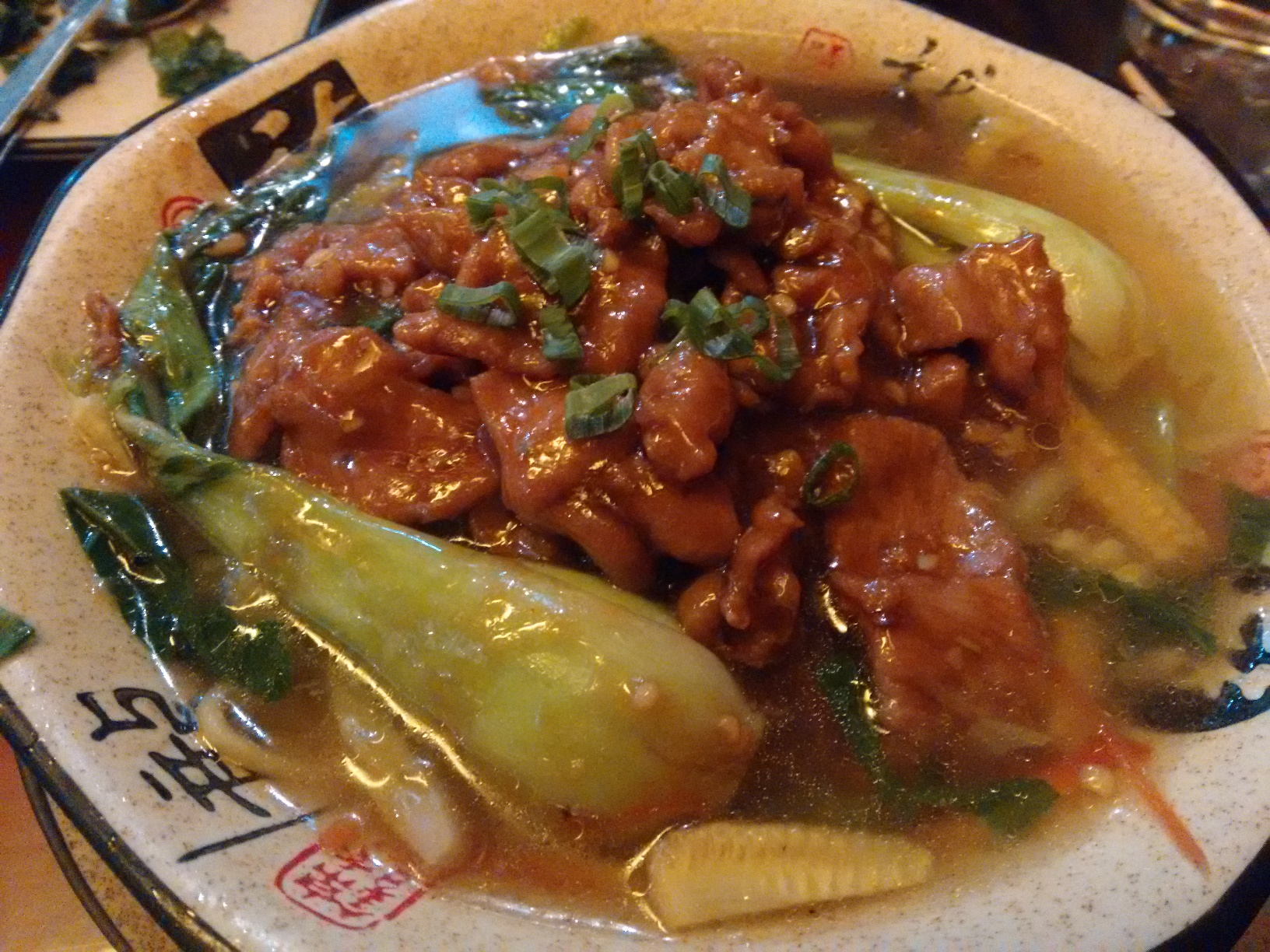 Our starter, the spicy tofu aniseed, came on a bed of crispy spinach. I like tofu, and had been intrigued about this dish. It turned out, to my pleasant surprise, to be a winner. The tofu was a firm silken one, dipped in a thin spicy (not too spicy) batter and deep fried, then tossed in what seemed to be a mix of spices, of which the only one I could clearly identify were whole Szechuan peppercorns.  No aniseed as far as I could tell, but good, nevertheless. And the contrast of textures—the custard-like tofu, the thin batter, the crisp spinach—was excellent.
