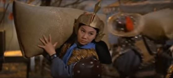 Not that she is rewarded for it; instead, she ends up with the warehouse division, rather like the Quartermaster Corps. The next time we see Mu-Lan, she’s busy hauling sacks into the warehouse. It’s while she’s at this work that she’s given a helping hand and a word of encouragement by a handsome young officer (Chin Han, who in real life married Ivy Ling Po two years after this film was made) whom she’s told is General Li.