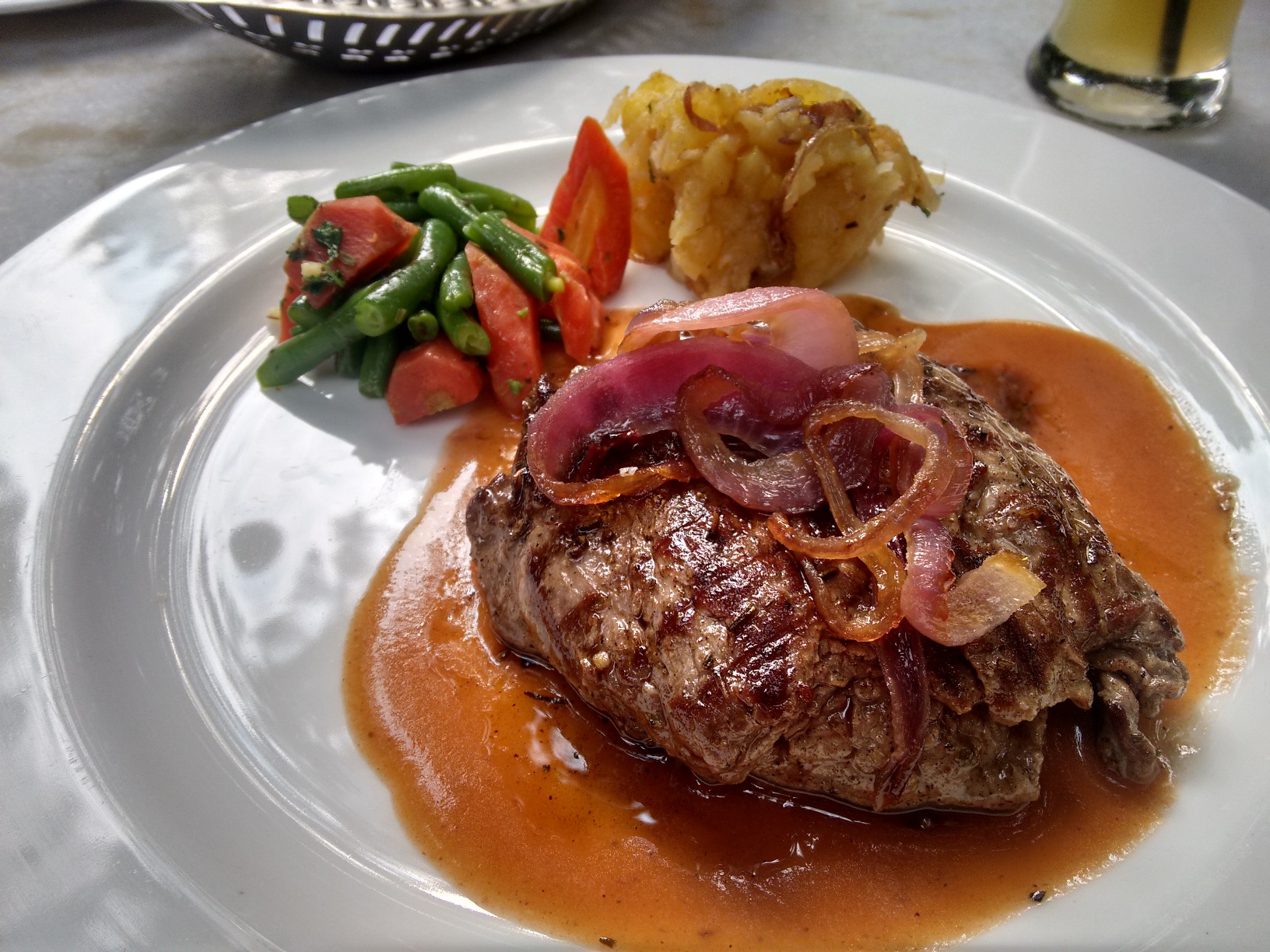 The heap of potatoes, boiled and broken up into chunky bits, flavoured with (sautéed with? I couldn’t tell) fried onions was good, the green beans on the side were fine, as was the little mound of caramelized onions on top of the steak. What didn’t quite make the mark for me was the flavour of the steak. This was supposed to have been marinated in garlic and green peppercorns, both fairly robust flavours (I would think), but the steak hadn’t a hint of either. In fact, if it hadn’t been for the red wine jus that accompanied this, the steak would have been pretty insipid.