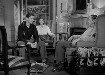 As Al discovers quickly, though, Peggy and Rob are not the children he knew so well. Peggy has grown up into a smart and self-confident young woman who works at the hospital, and Rob—Rob, on being given the souvenirs his father’s brought back for him (a samurai sword and a Japanese flag) doesn’t look too excited. In fact, all he can ask Al is if he met any survivors of Hiroshima; he’s been learning, in school, about the long-ranging effects of nuclear radiation, and (even though he doesn’t say it) it’s probably made him feel somewhat guilty that his father should have been in some way responsible.