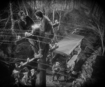 The fight is interrupted by a telephone call, which Tim receives right there, atop the pole. It’s momentous news: war has been declared. Even as Mary looks on in surprise, the men disperse, hurrying off to enlist. Wrenn is the first to slide down the pole—he’s in a rush to sign up and go to France, because those French ladies, he’s heard, are quite something. His fight with Tim put aside for the moment, he asks Tim why Tim isn’t coming, too. Tim explains that he has to finish the work he’s begun. He’ll complete that, and then follow.