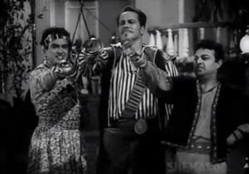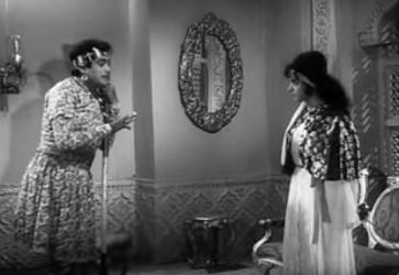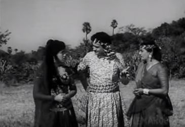 Baadal now goes off to meet Meenal. She tries to spring a trap, calling in guards to arrest Baadal. Baadal, not to be outdone, plays a trick on her with the help of Sheru and Kamal, and manages to convince her that he has more men at his command than she does. Meenal, therefore, backs off, and follows it up by singing a song of acquiescence. [The scriptwriter’s looking for ways to insert a song, as well as to provide some comic relief, no matter if the connect between them is utterly inane].