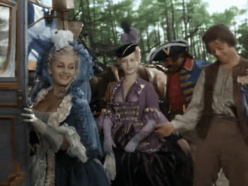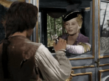 …which, as it turns out, happens to be the Princess Henriette (Sylvie Pelayo), accompanied by La Marquise da Pompadour (Geneviève Page). They are so grateful to Fanfan for saving them from the bandits that Madame de Pompadour kisses him, and he is so thrilled he kisses her back, and then proceeds to kiss the princess. It’s only when the royal guards—who’ve ducked into the shrubbery at the sight of the bandits—arrive that Fanfan discovers who this is. The King’s daughter!