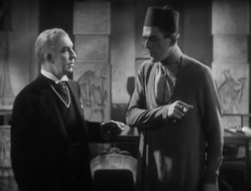 Muller’s words don’t really impress  the two archaeologists here. Sir Joseph Whemple (Arthur Byron) and his assistant Ralph Norton (Bramwell Fletcher) are more eager to get along and unwrap the mummy. Muller dissuades them—who knows what evil they will unleash? Sir Joseph agrees to put it off for the time being, but it’s obvious that he doesn’t believe any of this occult claptrap of Muller’s.