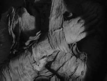 The next thing we see is a bony hand, wrapped in dry old bandages, reaching out for the scroll. Then, another bandage trails on the floor in the wake of someone we never see, disappearing through the doorway, while Norton laughs hysterically. Where the scroll lay on the table is now nothing except a very dusty handprint. When Whemple comes rushing into the room, it is to find Norton still laughing madly.
