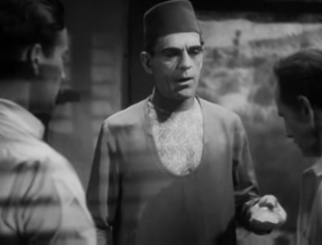 Just then, a stranger arrives. This man (Boris Karloff again, looking as impassive as in his brief appearance as the mummy, even though he’s now in modern Egyptian attire) tells them his name is Ardath Bey, and hands over an interesting little fragment of pottery. On it is inscribed the name of the Princess Ankh-es-en-amon of the 18th Dynasty. Both Frank and Pearson are intrigued by this, and even more so when this taciturn and mysterious visitor informs them that he is certain the tomb of Ankh-es-en-amon is somewhere in the vicinity.