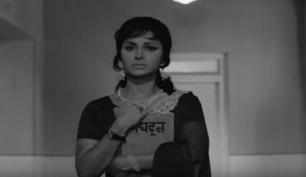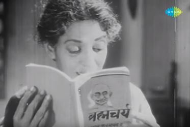 7. Leela Chitnis with Brahmacharya (Suhaagan, 1964): A book by Mahatma Gandhi about his thoughts on celibacy (and his experiments with it?) is bang on in a film about a man whose marriage cannot be consummated and who is forced to be celibate. In this scene, two people read the book by turn (and it’s implied that a third has already read it). Guru Dutt’s character discovers Brahmacharya in his wife’s (Mala Sinha’s character’s) table drawer. He reads it, and is discovered by his mother, played by Leela Chitnis. Egged on by her distressed son (who now realizes just what his wife is going through), she is the one who actually reads out aloud an excerpt from the book.