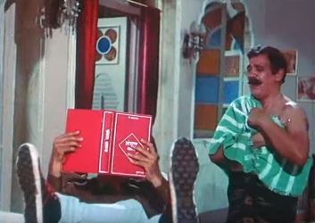 10. Sunil Dutt with Sansaar Shastra (Padosan, 1968): And, to end the list, another book that plays an important part in a film. Sunil Dutt’s Bhola in Padosan models his life on the principles set forth in Sansaar Shastra, a work on how to live in the world—in essence, a book expounding on the virtues of adhering strictly to the four ashrams set forth in ancient classical texts. Bhola, being the lakeer ka fakeer that he is, takes Sansaar Shastra to be gospel truth and goes about with it for a good bit of time before realizing that there are better ways of spending time than reading an outdated book like this.
