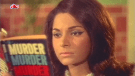 5. Waheeda Rehman with Murder Murder Murder (Baazi, 1968): This one’s not a prop meant to show the character of the character (though it probably does, to some extent—Waheeda’s a smart modern girl, so her reading murder mysteries isn’t surprising). Rather, in a film that’s centred around a murder followed by some very odd revelations, it’s a neat little way of adding to the tone of the film.