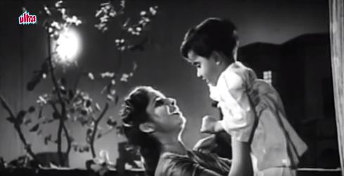 Here, instead of a teacher setting riddles about food, there’s a nanny singing to her charge. Geeta Bali plays nanny to a little boy whose invalid mother looks fondly on as her child is entertained. The moon, up there, is making malpuas with boor (soft brown sugar). He’s eating his malpuas in a great big thali, but Munna has to make do with a bowl more suited to his relatively diminutive size. Cute, classic kiddie song, and Geeta Bali is so animated, her eyes so full of life.