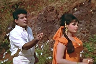 7. Ae phoolon ki raani bahaaron ki mallika (Aarzoo, 1965): Aarzoo was a huge hit, and though I don’t like it myself (it gets too, too melodramatic and weepy in the latter half), what I do acknowledge is that it had excellent music. From Ae nargis-e-mastaana to Chhalke teri aankhon se—there are several songs here that praise the lady (Sadhana), but I think the one which most epitomizes the ‘serenade’ is this one. Her lips are lotuses, her way of fluttering her eyelashes is devastating. Her smile, her walk… everything about her is beautiful. Her flowing hair imparts cool shadows to the surroundings themselves: she is the queen of the flowers, the very empress of the spring.