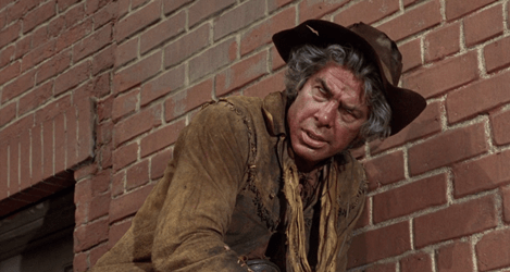 Or is he? Because the man who has to be helped out of the back of the stagecoach (he’s not even in the coach; he’s in the back, with the luggage) inspires no awe, no fear, nothing but shock and horror. This wreck, completely sodden with drink, can’t even walk straight, let alone shoot straight.