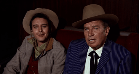 The Ballad of Cat Ballou, the song the two shouters sing every now and then throughout the film. It’s not as if the action really stops: it goes on in the background. It’s just that Nat King Cole and Subby Kaye come onscreen, with their banjos and/or guitars, and sing a song that comments on what’s going on—often hilariously at odds with what is really going on. (The “I say she’s the devil!” is about a Cat Ballou who’s really not such a very evil woman, as it turns out, and the “steely-eyed Kid Sheleen”, with “the eyes of a killer” is more bleary-eyed and bumbling than anything else). It’s a delightful song in all ways: delightful lyrics, a very catchy tune, and superbly sung.