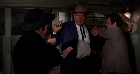 The comedy. I love me a good comedy, and there was so much in Cat Ballou that was laugh-out-loud funny. Some of it is slapstick (the free-for-all at the barn dance, Percival’s attempts to have a bath in a moving train), but a lot of it comes through in the situations and—equally importantly—through the dialogue, which is fantastic. This little exchange between my two favourite characters from the film is an example (Kid Sheleen, having managed to overcome his dependence on drink, chooses absolutely the wrong moment to fall prey to liquor again):
