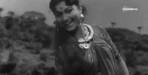 1. Boojh mera kya naav re (CID, 1956): This song appears at the top of the list for a simple reason: because it is my earliest memory of the voice of Shamshad Begum (though at the time I didn’t know the name of the singer). I was perhaps about nine years old when I watched CID, and I still remember being entranced by Boojh mera kya naav re. Not just by the picturization—the women filling their gagris and dancing as they did so; Minoo Mumtaz, all effervescent and teasing; a debonair Dev Anand and a sullen but very pretty Shakila—but also by the music and the singing. I love Shamshad Begum’s singing: it has so much verve, and it so completely reflects the flirtatiousness of the lyrics.