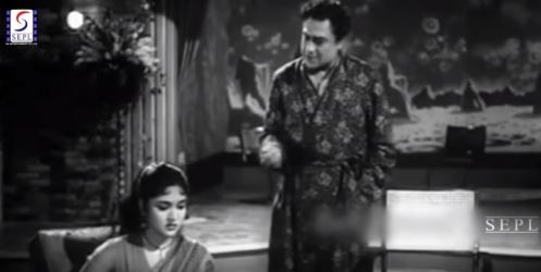 Now Rajni tries another avenue. She’s having an affair with a junior actor named Mohan (Iftekhar, in an unusual role: the first time we see him talking in this film, it’s a romantic scene, between Rajni and Mohan). Rajni has concocted a plan to sabotage Kanta’s career, and to further Mohan’s career, at the same time.