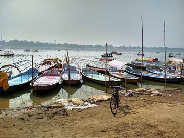 Gulls squawked and wheeled beyond the rows of boats that fringed the riverbank. Boatmen gathered around us, offering to take us right up to the Sangam (the actual confluence of the Ganga and Yamuna—you can see the waters mixing only if you’re on the river itself; it’s not visible from the bank). Much haggling later (and with telephonic advice from a local, one of the Sanchaari organizers), we settled on a price that seemed acceptable. We knew that we wouldn’t be able to haggle any more, but I’m pretty certain we got conned anyway.