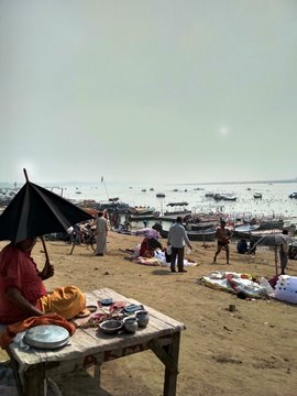 It’s been less than a year since the last Mahakumbh—‘the world’s largest religious gathering’—and for someone like me, who detests crowds, this was probably the best type of day to visit. Pratyaksha and I, both togged up for our aborted sessions (we hadn’t even brought along clothing more suited for travel adventures!), were picked out easily by the many eagle-eyed beggars, boatmen, and vendors of sundry stuff. A sadhu sitting under an umbrella watched as a little boy came around showing us a tiny but lethal-looking cobra coiled up in a basket, which he hoped we’d probably bow before and offer up some coins to.