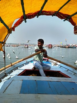 As our boatman rowed us away from the bank, the Allahabad Fort—built by Akbar, and with most of its structures demolished by the British post 1857—behind us, the gulls followed. They’re all around, flapping about and swimming around the boats, eagerly waiting for any scraps that might come their way. A vendor of birdfeed, all neatly packaged, came by in a boat, but we shooed him away.