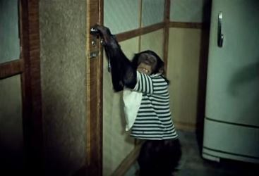 The first mate has found ink spilled all over the ship’s log, and now the mysterious culprit finally reveals itself, by turning a fire extinguisher on the party gathered to hear Shuleykin’s lecture on tigers. The chimp (not a macaque, as everybody on the ship refers to it) is the gift the agent had left.