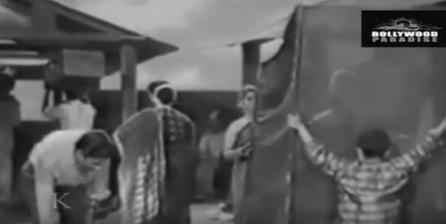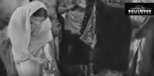 Finally, there is Chameli Bai (Manorama), who comes on board with her daughter Roopa (Waheeda Rehman). We—and Chhagan, and the rest of the crowd, both at the docks and on the steamer—do not get even a glimpse of the beauteous Roopa’s face because even before she sets foot on the ground, she’s surrounded by a mobile purdah, carried by two servants. Chameli Bai is very particular about her daughter’s modesty and honour.