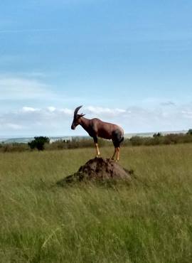 And topi, which swiftly became among the animals the LO got most excited about (perhaps because she could recognize it so easily? It is rather distinctive, what with its dark blueish-grey rump patches). And it’s highly visible: topis tend to stand on whatever elevations they can find—usually termite mounds—to keep an eye out for predators.