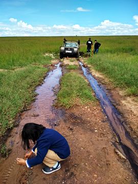 Talking of enterprise, a short while after we alighted from our stuck vehicle, I was busy looking out across the grassland to see if there was any wildlife around, when the LO said, “Look, Mama, I’m doing farming.” Which consisted of clearing the land – she was pulling up, from the roots, grasses and pitching them out. Had to be dissuaded and put to work searching for pretty pebbles instead!