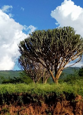As we continued through the countryside, it began to remind me of Rajasthan: the same arid landscape (though the Masai Mara province, thanks to prolonged rains this year, is much greener); thorn trees; herds of cattle or sheep or goats being watched over by men or boys draped in colourful shukas. And there’s the occasional tree here and there, sometimes acacia, but also—and this isn’t there in Rajasthan—a very impressive tree known as the candelabrum spurge. These, at times, were the size of a house.
