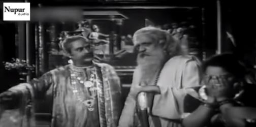 He does this, again and again, and Suvarna Sundari warns her husband that he mustn’t pull her out of her duties at court so abruptly. But Jayant isn’t listening, and he once again starts playing the flute—just as Suvarna Sundari is dancing in front of Indra (DK Sapru). The push-and-pull, between the celestial court and Jayant’s flute-playing, makes Suvarna Sundari swoon. It turns out she’s pregnant, and Indra blows his top when he discovers that this female has had the gall to fall in love with a human being!