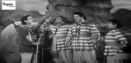 Fortunately for Jayant, he has a loyal friend who helps him escape before any action can be taken. A fugitive now, Jayant soon comes up against a trio of unscrupulous and somewhat comical ruffians: Khatpat (Radhakrishna), Chatpat (Agha) and Sarpat (Mukri). These three scoundrels have blocked the road and demand money from wayfarers. When Jayant tries to defy them, Khatpat offers a compromise: trek up to a mountain cave nearby and find out what’s causing all the din that emanates from there.