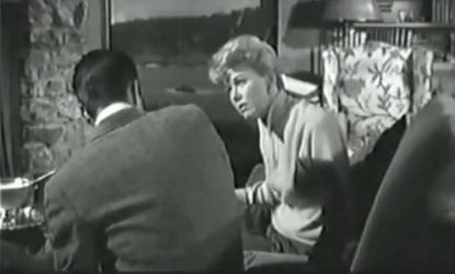 The reason for this fight has been Lyle’s jealousy. He saw Julie chatting with her friend Cliff Henderson (Barry Sullivan) at the club, and sprang to the conclusion that Julie was having an affair with Cliff. Julie stormed out of the clubhouse, indignant at this unwarranted suspicion, but Lyle is so mad with jealousy that Julie’s anger has been replaced with a sort of gibbering fear.