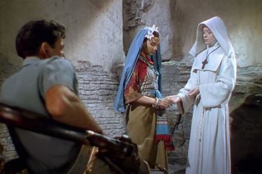 A beauty which is appreciated by another newcomer: the Young General (Sabu) has made up his mind to be taught by the nuns, and though Clodagh tries to tell him they can’t teach him much of what he wants to learn, he insists that he will learn whatever they can teach: French, for instance. The Young General can barely get through his lessons without stumbling because there, looking on adoringly at him from under a screen, is the beautiful Kanchi.