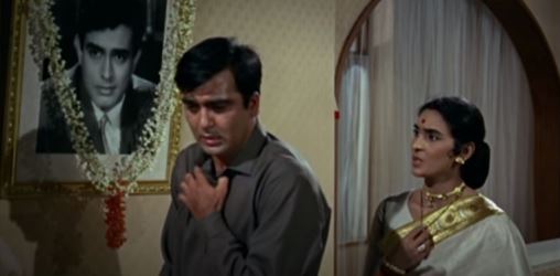 What it’s about: Blind heiress Gauri (Nutan) is married off to Sanjeev (Sanjeev Kumar) by her greedy uncle, who doesn’t inform Sanjeev that Gauri is blind. Right after the wedding, when Sanjeev discovers the truth, he runs away, deserting his bride. But Sanjeev’s best friend, Sunil, goes after him, to find Sanjeev and reason with him. Sunil succeeds, but he and Sanjeev go hunting before Sanjeev can return to Gauri—and Sanjeev ends up lost and presumably dead. Sunil returns to break the news to Gauri, who has just had her eyes operated and can now see.  But because the trauma of being widowed might make Gauri blind again, her uncle persuades Sunil (who already has a girlfriend) to pretend to be Sanjeev.