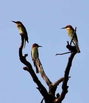 Along the way, as we went past a half-dried stream bed, our guide heard a langur’s alarm call—a coughing sound—and made our driver stop. That, he said, indicated that a tiger was in the vicinity. He quickly spotted the langur, and we settled down to wait, watching the nallah in anticipation: would the tiger appear? Wouldn’t it? In the meantime, we spotted various birds round about. A pair of stork-billed kingfishers in a nearby tree, a trio of chestnut-headed bee-eaters looking little cheeky little bandits, plotting some poor bee’s downfall…