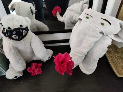 (By the way, one last bit of happiness for the LO. On our last day at the Riverview Retreat in Corbett, we went for a leisurely, late breakfast, after our jeep safari. When we got back to our room, it was to find that a housekeeping staff member had come by and cleaned our room. By way of ‘a gift for the child’, a bath towel had been folded up creatively into a charming little elephant, its eyes crafted from bits of leaf, and a hibiscus flower fitted into its trunk. This has been placed next to the LO’s teddy bear—she likes to carry one of her teddies with her on every trip—and a hibiscus placed in front of the teddy as well. The LO was enchanted, and so were we).