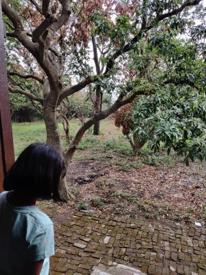 We wandered around; the LO didn’t seem especially interested in Corbett or in the memorabilia around, but she did take a peek outside, where a grove of mango trees spreads.