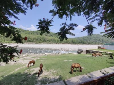 At Corbett, we had a reservation at a resort where my husband and I have stayed before: The Riverview Retreat, on the bank of the Kosi River. This stretch, of a couple of kilometres along the river, is simply one hotel or resort after another. Forests stretch across the river, and on the other side of the road that runs along the front of the hotels.