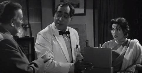 Much later, Manu wakes up, to find that the car is now parked in Renu’s garage. Having gotten his bearings, he sneaks into the kitchen and polishes off some fruit before the watchman outside notices and raises the alarm. Many adventures now ensue, as Manu blunders into Renu’s room, and Renu’s very weathy father Kishanchand (SN Bannerjee) comes thundering to his daughter’s rescue, only to be told that all is well. Manu has hidden under the quilt.