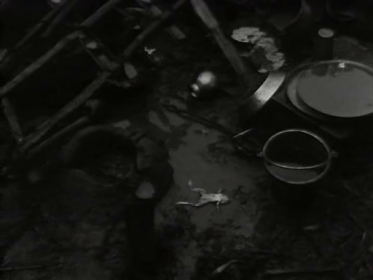 Then, there’s the sheer beauty of the frames Ray composes. The wind rippling through the kaash, or ruffling the edges of the lotus leaves on the pond. Sarbojaya, silhouetted against a window. Even something as prosaic as a dead frog lying in a pool surrounded by the wreckage of a hut in the wake of a storm.