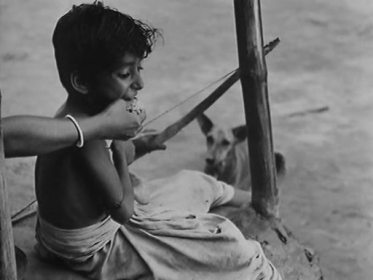 The bulk of Pather Panchali is set a few years later, when Apu is a young boy (Subir Bannerjee), the darling of his doting family. Sarbojaya sits patiently, feeding him one morsel at a time, while Apu practices archery with a makeshift bow and arrow, and finally runs off, too distracted to want to eat any more.