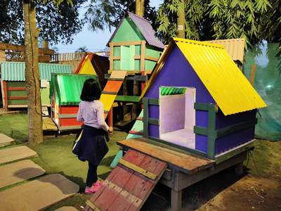 And for the LO, the imaginatively designed and very fun play area under the trees was the biggest highlight. She jumped about on the giant Snakes-and-Ladders grid, ooh-ed and aah-ed over the giant chessboard, and had a ball climbing and clambering, swinging, and exploring the little wooden houses alongside.